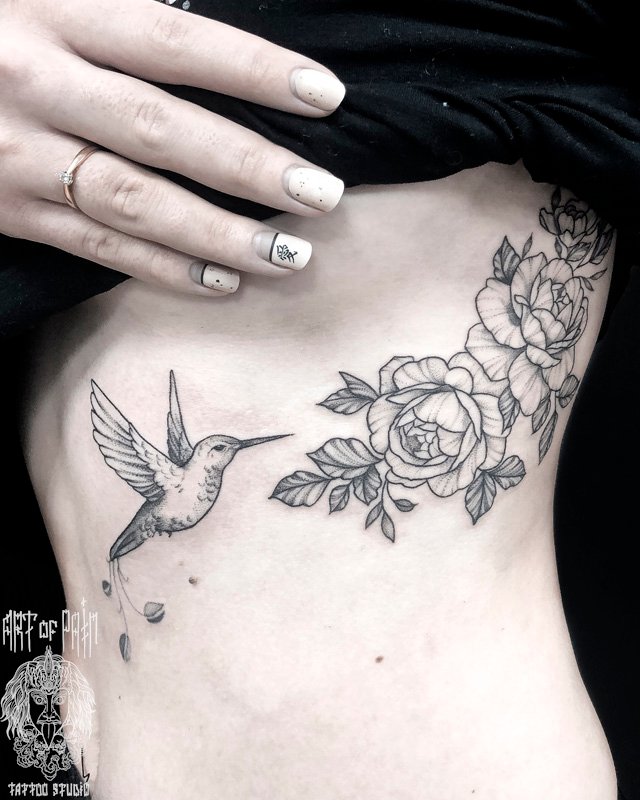 Татуировка женская графика на боку цветы и колибри (Мария Котова) 5240