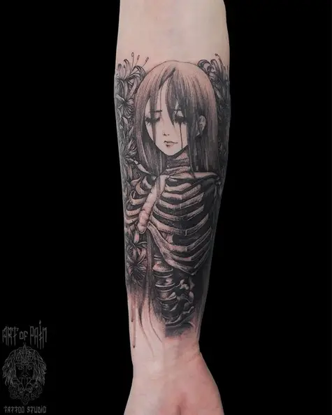 Татуировка женская графика на предплечье девушка скелет (Анастасия Родина) 5241