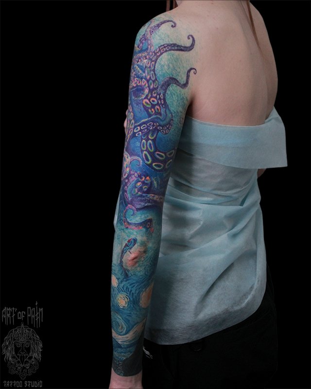 Татуировка женская нью скул тату-рукав Ван Гог, звездная ночь, море, осьминог (вид сзади) (Анастасия Родина) 5296
