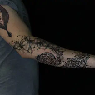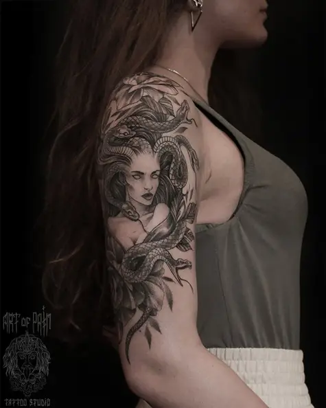 Татуировка женская графика на плече Горгона Медуза 5381