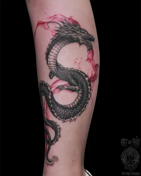 Татуировка женская графика на голени дракон и красное пламя (Анастасия Родина) 5385