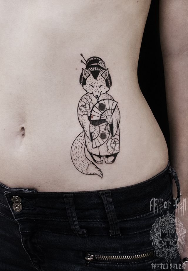 Татуировка женская графика на боку лиса в японском кимоно 539