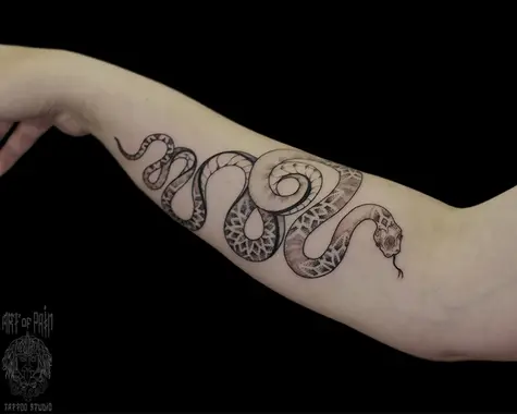 Татуировка женская графика на предплечье змея с узором (Надежда Полякова) 5411