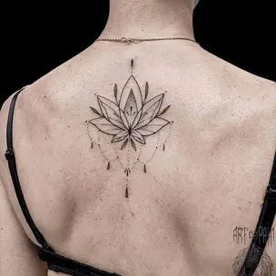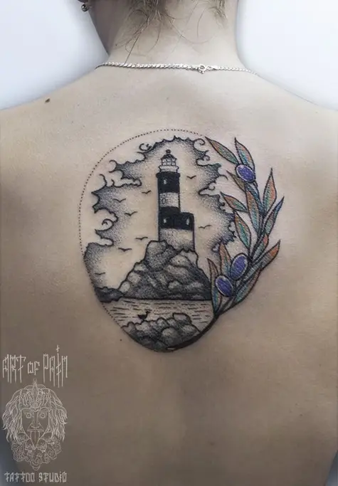 Татуировка женская графика на спине маяк 542