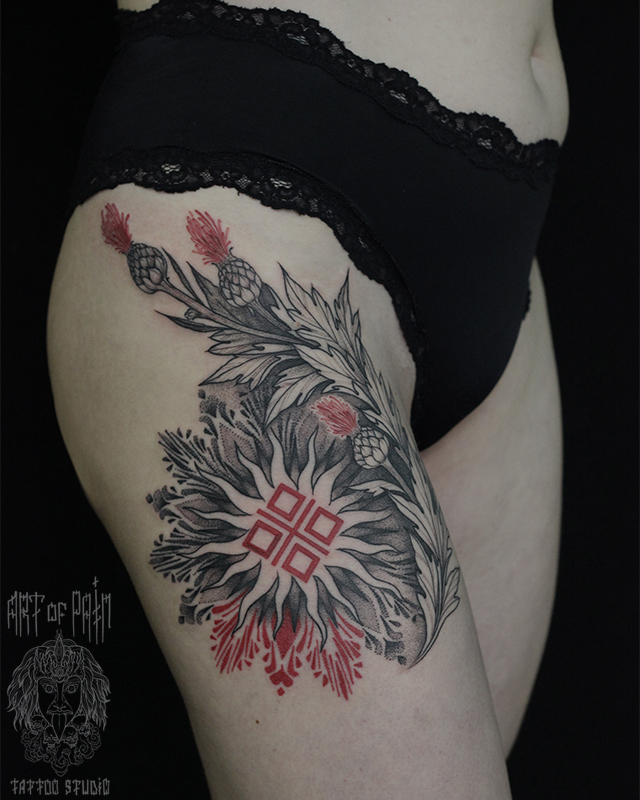 Татуировка женская орнаментал и графика на бедре мандала и репейник (Надежда Полякова) 5425