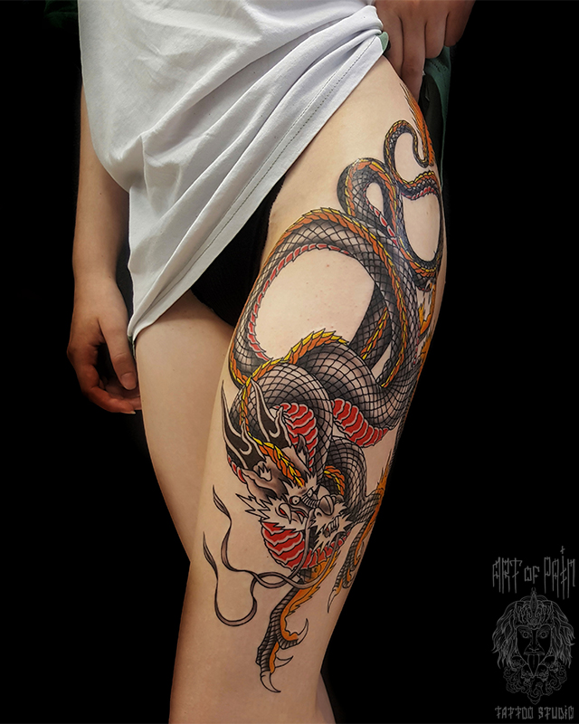 Татуировка женская япония на бедре дракон (вид спереди) 5503