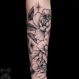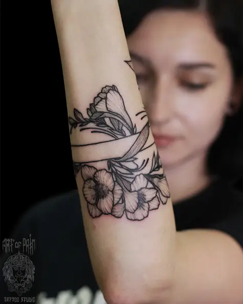 Татуировка женская графика на предплечье цветы под белым браслетом (Надежда Полякова) 5568