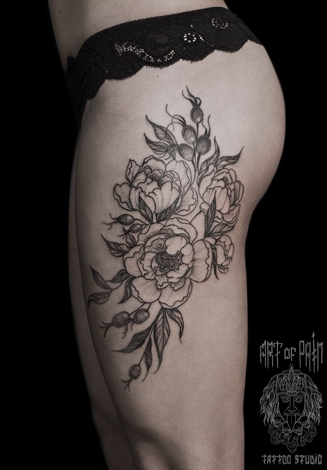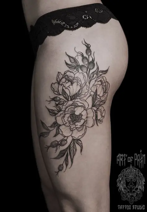 Татуировка женская графика на бедре шиповник 558