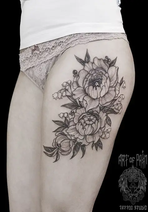 Татуировка женская графика на бедре пионы и ландыши 560