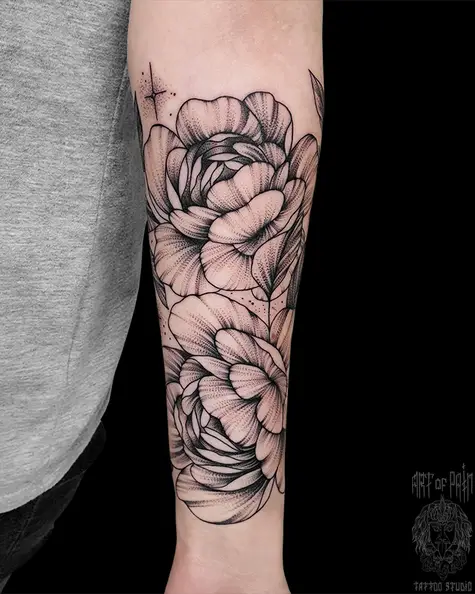 Татуировка женская графика и дотворк на предплечье цветы пионы 5605