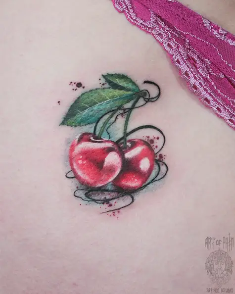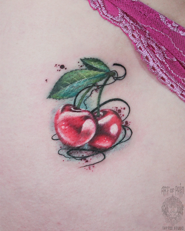 Татуировка женская реализм на бедре вишня (Анастасия Родина) 5612