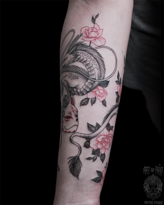 Татуировка женская графика на предплечье дракон и маска (Анастасия Родина) 5643
