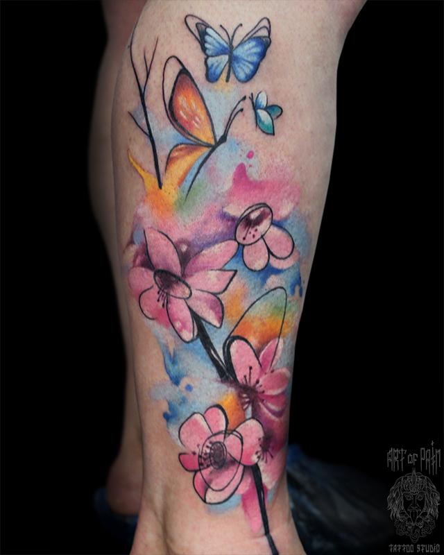 Татуировка женская акварель на голени цветы (Анастасия Родина) 5647