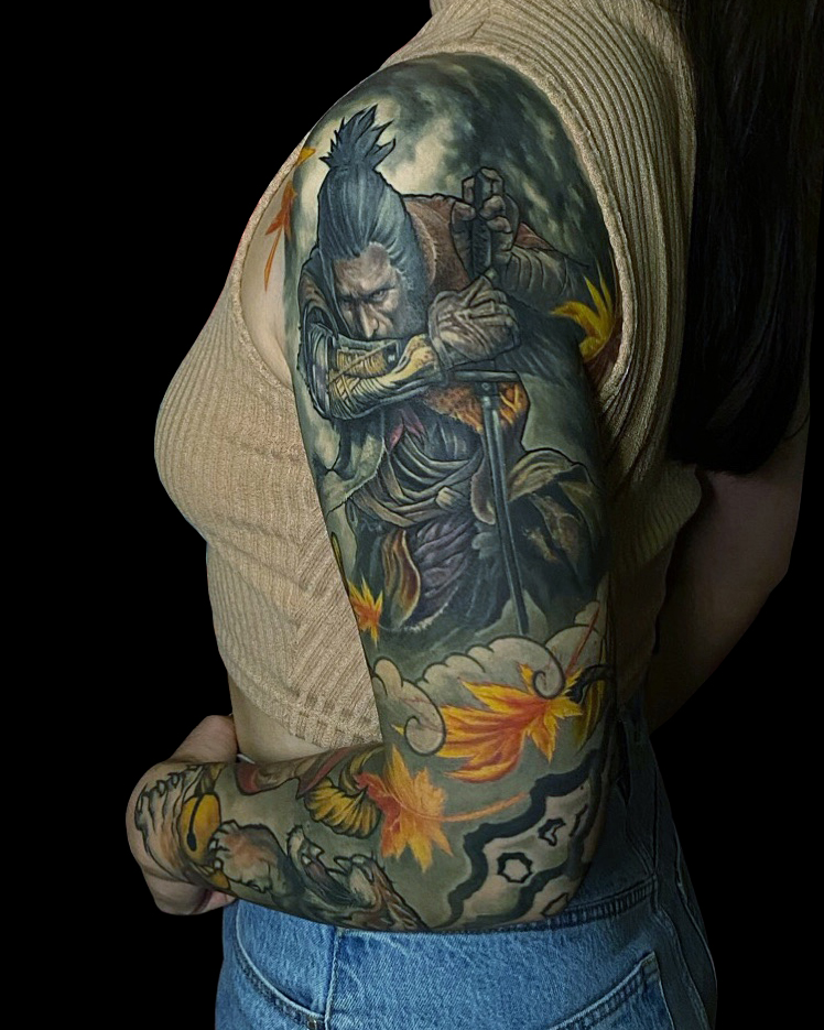 Татуировка женская япония тату-рукав самурай, тигр, дарума (вид сбоку) 5660