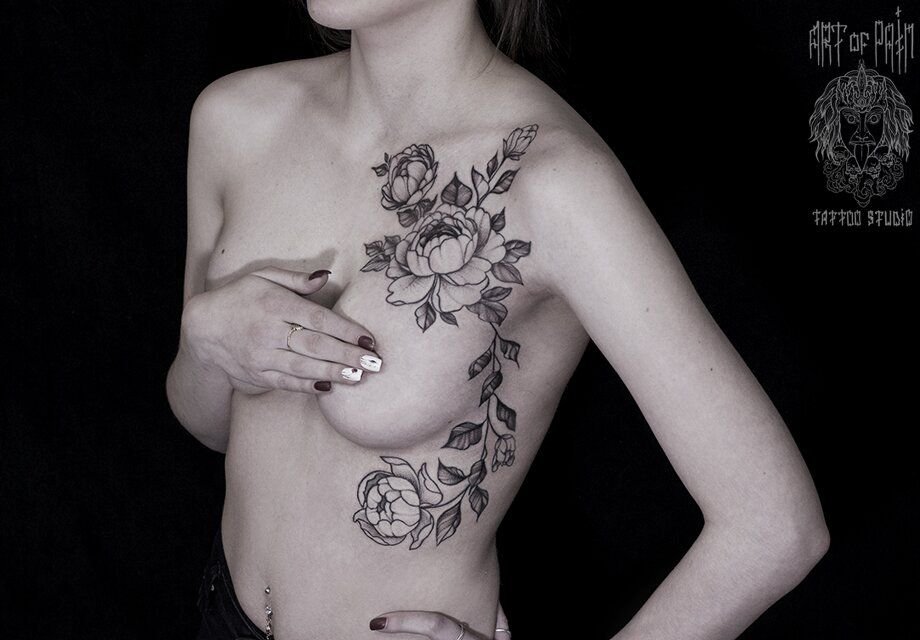 Татуировка женская графика на груди пионы 568