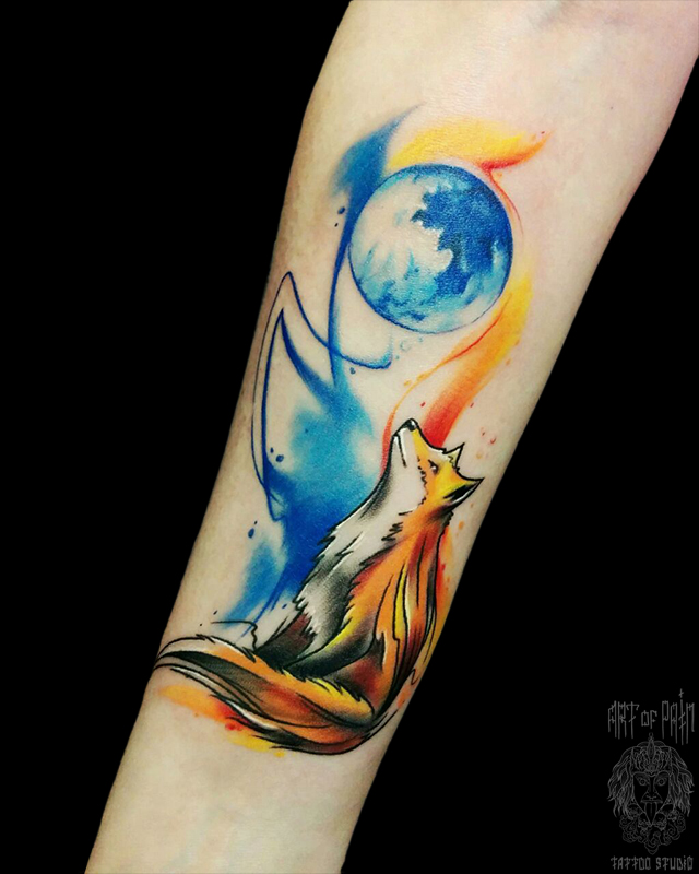 Татуировка женская акварель на предплечье лиса и голубой шар (Евгения Шмидт) 5727
