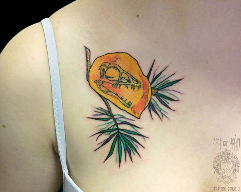 Татуировка женская ньюскул на груди растения и череп в янтаре (Евгения Шмидт) 5731