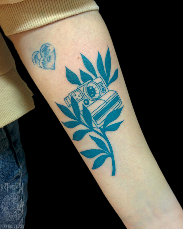 Татуировка женская графика на предплечье растение и фотоаппарат (Евгения Шмидт) 5737