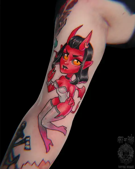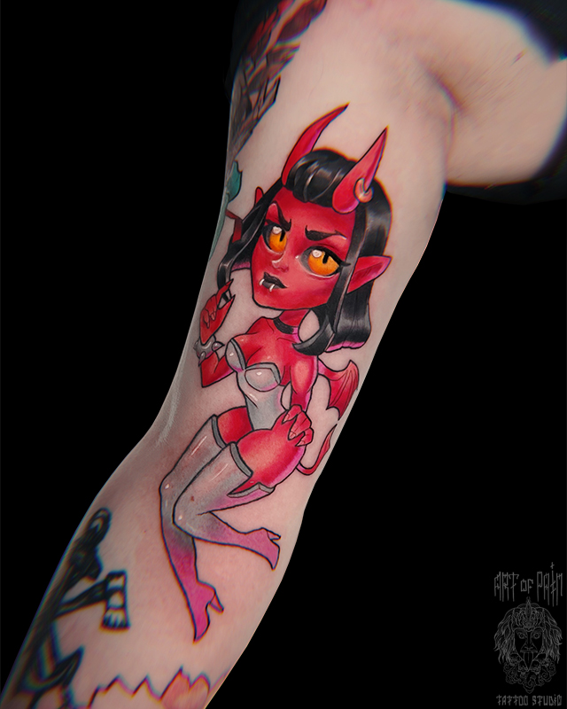Татуировка женская нью скул на руке дьяволица 5775