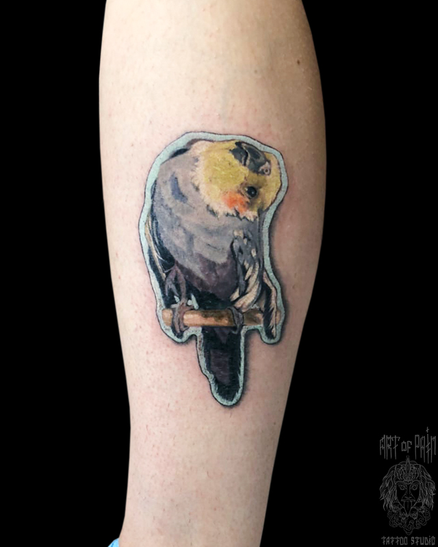 Татуировка женская реализм на голени австралийский попугай 5852