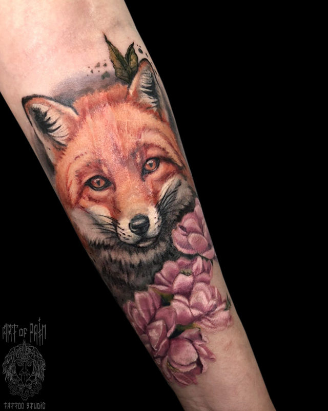Татуировка женская реализм на предплечье лиса в цветах 5858
