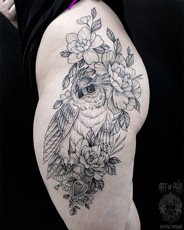 Татуировка женская графика на бедре филин (Мария Котова) 5876