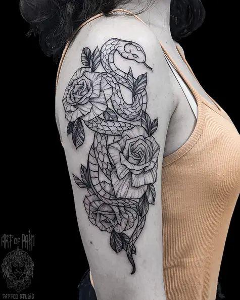 Татуировка женская графика на плече змея, цветы (Мария Котова) 5894