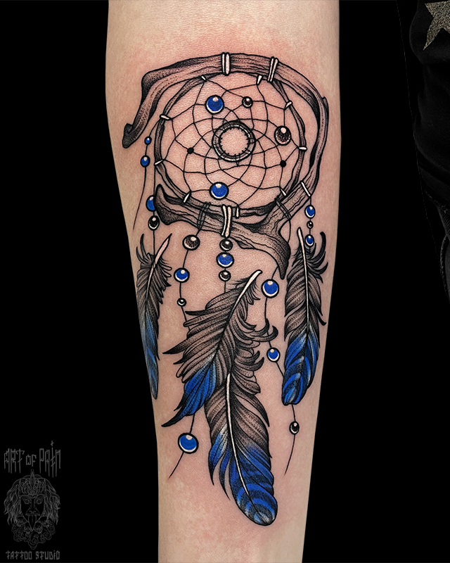 Татуировка женская графика на предплечье ловец снов с синими бусинами 5943