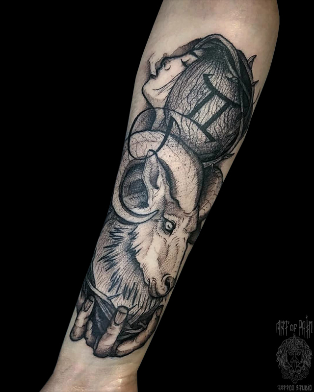 Татуировка женская графика на предплечье девушка и козёл (Кирилл Плотников) 6000