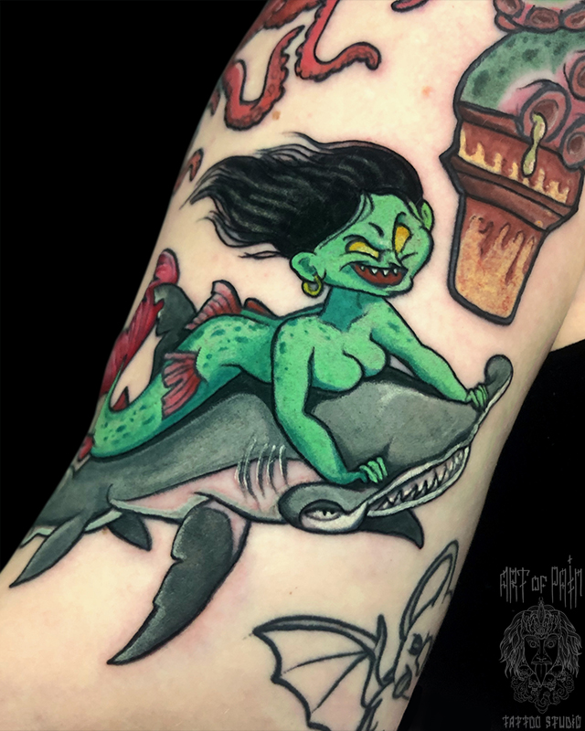 Татуировка женская нью скул на руке русалочка на акуле 6177