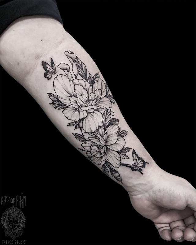 Татуировка женская графика на предплечье цветы и бабочки (Мария Котова) 6186