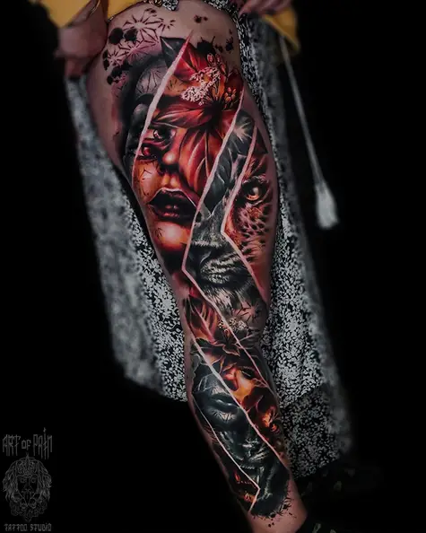 Татуировка женская реализм на ноге девушка и гепард (Дмитрий Шейб) 6192