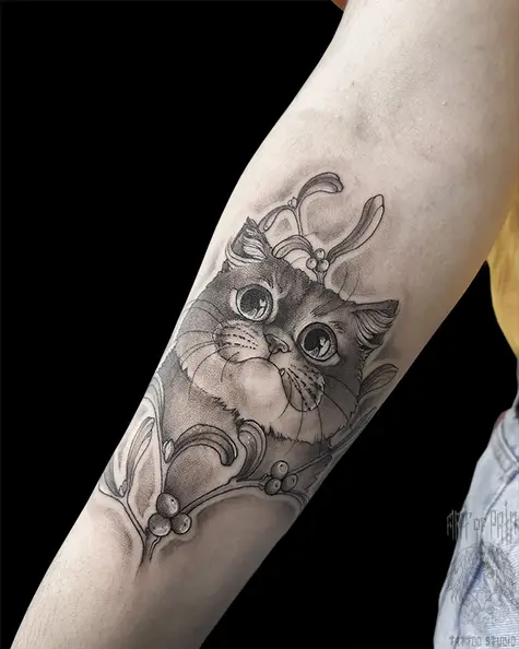 Татуировка женская графика на предплечье котик и ягодки 6226