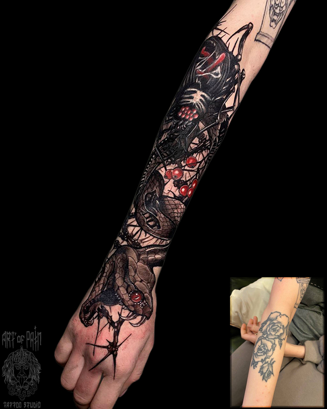 Татуировка женская нью скул на предплечье змея и паук (Кирилл Плотников) 6309