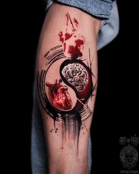 Татуировка женская треш полька на голени сердце и мозг (Слава Tech Lunatic) 6335