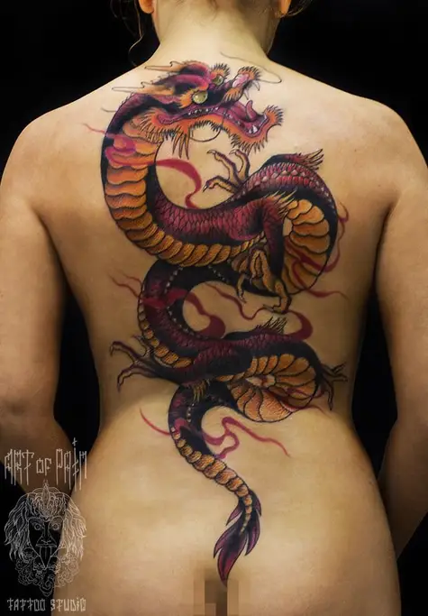 Татуировка женская в японском стиле на спине и пояснице дракон 634