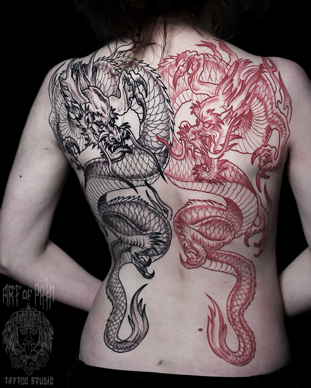 Татуировка женская графика на спине драконы (Юрий Хандрыкин) 6416