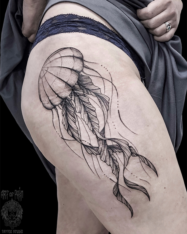 Татуировка женская графика на бедре медуза (Мария Котова) 6423