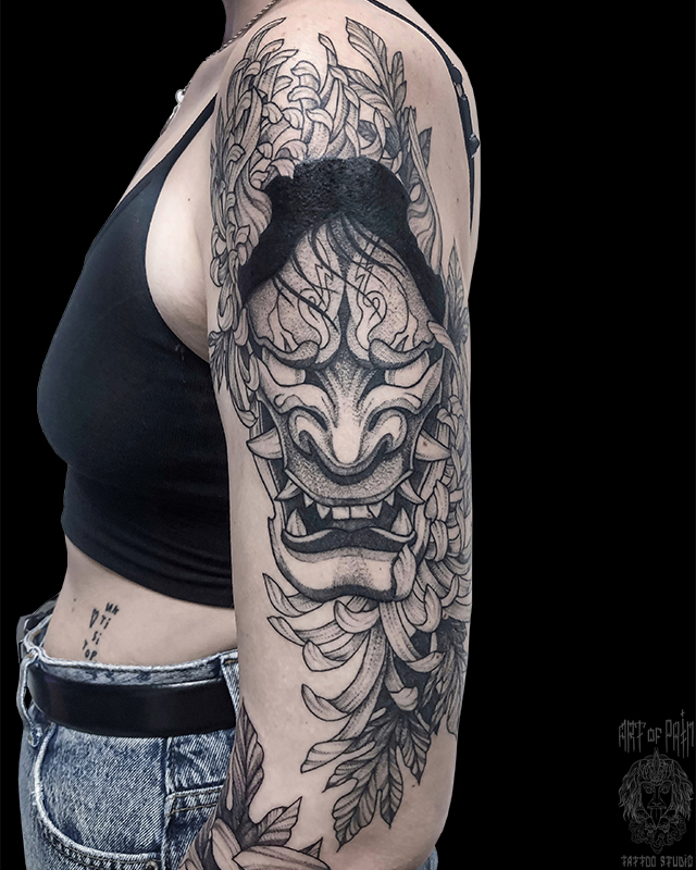 Татуировка женская графика и япония на плече маска Ханья (Мария Котова) 6445