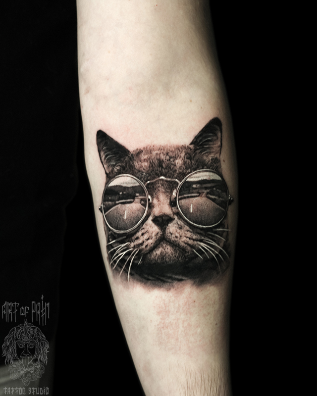 Татуировка женская реализм на предплечье кот в очках 6453