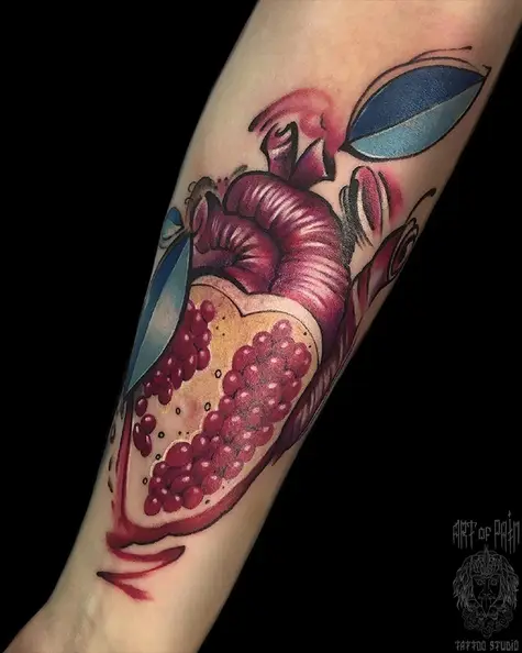 Татуировка женская нью-скул на предплечье сердце-гранат 6482