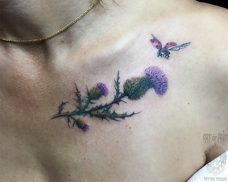 Татуировка женская реализм на груди чертополох (Анастасия Родина) 6525