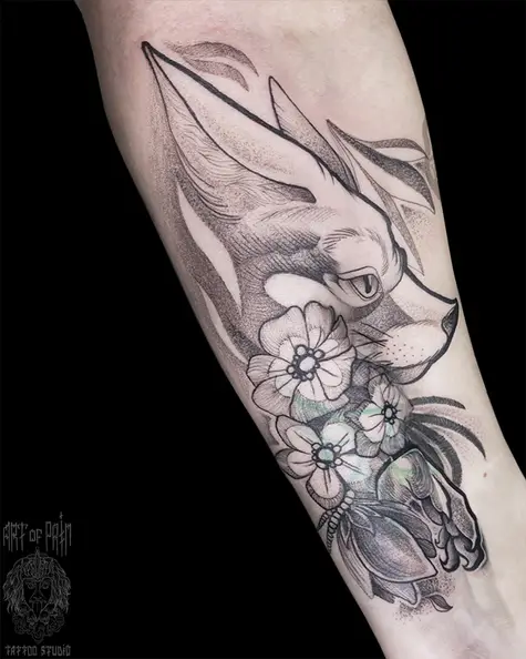 Татуировка женская графика на предплечье лиса с цветочками 6567