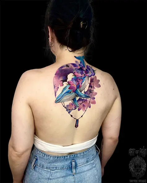 Татуировка женская акварель на спине кит 6579