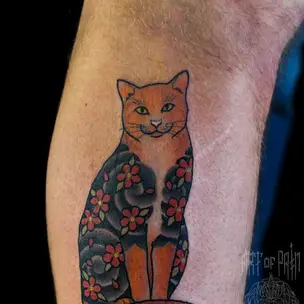 Татуировка женская япония на предплечье кот в синем кимоно 6594
