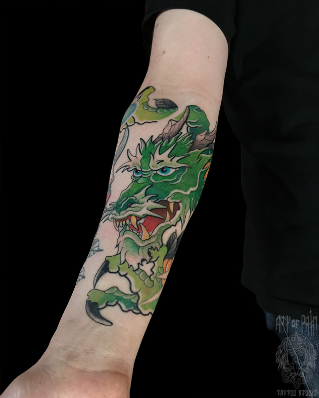 Татуировка женская япония на предплечье зеленый дракон 6605