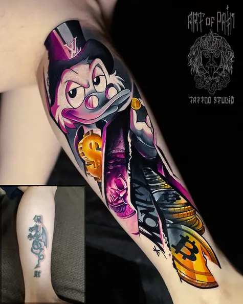 Татуировка женская нью скул на голени Скрудж (Дмитрий Шейб) 6722