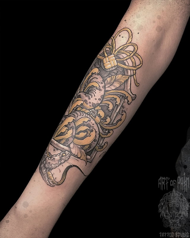 Татуировка женская графика на предплечье желтая хризантема и змея (Денис Марченко) 6771