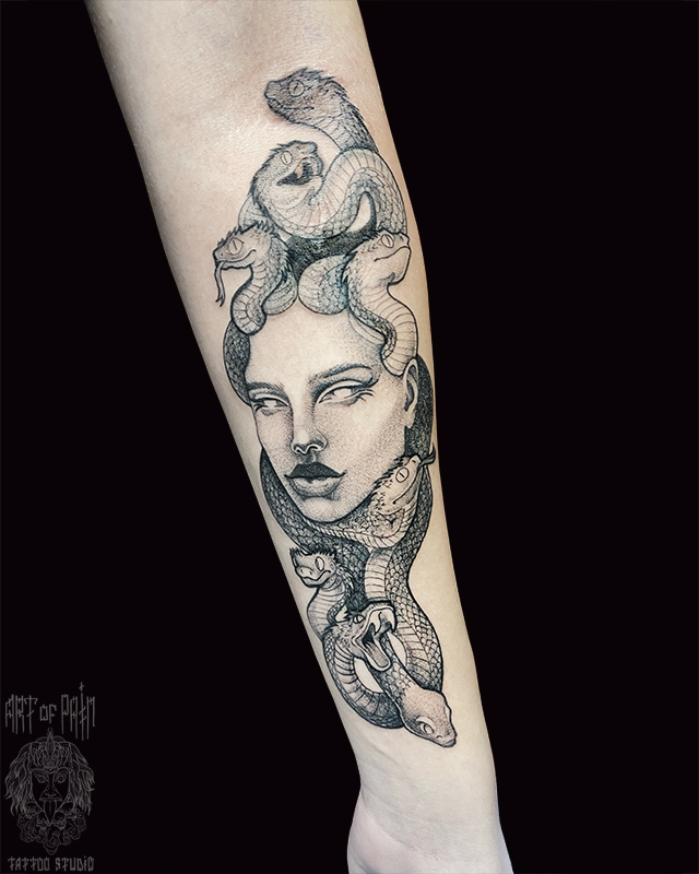 Татуировка женская графика на предплечье Горгона Медуза 6777