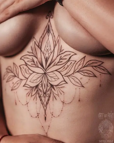 Татуировка женская графика на рёбрах лотос и узор 6828